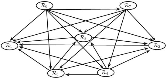 Figure 3. Incoming flow of .The alternative with larger outgoing flow and the smaller incoming flow is considered as the favorable or preferable alternative. The preferences of alternatives on the basis of these positive and negative outranking flows can be computed by using the following expressions, respectively.The intersection of these two preferences provides the PROMETHEE I partial ranking of alternatives as follows:In PROMETHEE I partial ranking, all alternatives are not comparable, so the complete ranking of alternatives is obtained by proceeding the one more step of PROMETHEE II as follows. - (b)