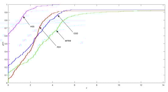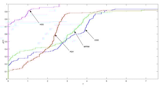 We implemented HSS method using the following parameters and while the parameters used for CGD, PDY and MFRM methods come from [,,], respectively. We set the terminating criterion for the iteration process as or and declare failure (denoted by "-") whenever the number of iterations exceeds 1000 and the terminating criterion has not been satisfied.