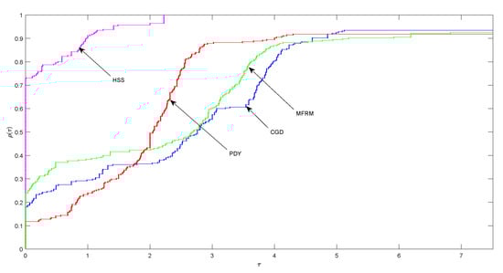 In this experiment, we apply HSS algorithm to solve eleven test problems and compared the numerical results with some state of the art existing methods namely: modified Harger and Zhang CG method denoted as CGD (also known as CG_Descent) by Xiao and Zhu [], modified Dai–Yuan CG method denoted as PDY by Liu and Feng [] and modified Fletcher–Reeves CG method denoted as MFRM by Abubakar et al. []. We considered eleven problems where Problems 1–10 are solved with dimension and Problem 11 with dimension (see Appendix A). We used six different starting points, that is, and . This brings the total number of problem runs in this experiment to 306.