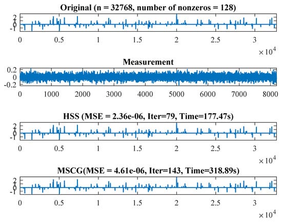 We compared HSS algorithm and the modified self-adaptive CG method (MSCG) [] based on their performance in restoring a length-n sparse signal from k observations. We used three metrics; namely ITER (number of iterations), CPU (CPU time) and mean of squared error (MSE) to evaluate the performance of each method. The MSE is usually used to assess the quality of reconstruction and is calculated using the following formula