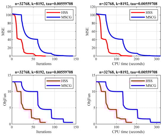 Comparison result of HSS and MSCG. The x-axis represents the number of Iterations top left and bottom left and CPU time in seconds top right and bottom right. The y-axis represents the mean of squared error (MSE) top left and top right and the objective function values bottom left and bottom right.