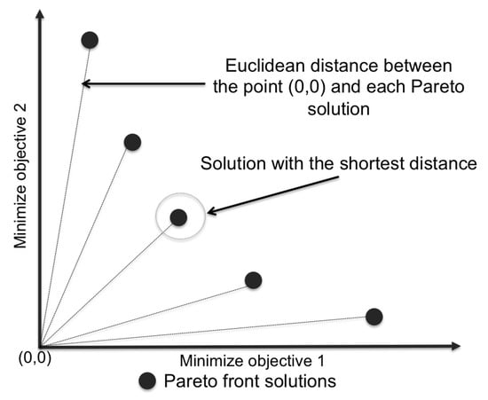 To carry out a comparison between the multi-objective approach and the single-objective approach the linear programming technique for multidimensional analysis of preference (LINMAP) was used [50]. In the LINMAP decision approach criterion, from the accumulated Pareto front of ten executions, the solution nearest to a reference point which is (0, 0) is chosen. To find this solution all the solutions were normalized and the Euclidean distances were computed between the reference point and each Pareto solution as is shown in Figure 4. The solution with the shortest Euclidean distance is referred to as the chosen solution in this work.