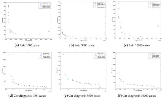 Figure 5d–f show how the genetic solution tends to choose solutions with a smaller log-likelihood but more complex, and a similar situation occurs in Figure 5g–i where the GABN chooses solutions less complex but with a worse log-likelihood value.