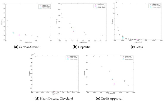According to Deb [42], a multi-objective optimization problem (MOOP) can be seen as a search problem that aims to minimize or maximize two (or more) objectives that are usually in conflict. Without loss of generality, a MOOP can be defined as: where is an n-variable decision vector, is the set of objective functions to be minimized or maximized, and l is the number of objectives (in our case, we have two objectives: the LL and the complexity ).