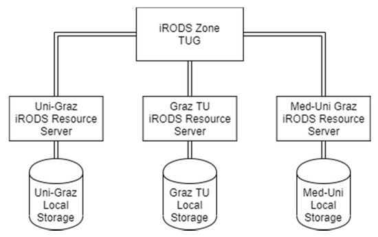 The iRODS deployment for CAT consists of one iRODS catalogue server (iCAT) holding the metadata for the zone TUG. The iCAT server is located in the central deployment at the CAT core, and manages metadata for all available iRODS resources servers at KFUG, MUG and TUG. For this deployment, no replication or distribution of data is allowed, as data should not leave the universities’ boundaries unintentionally. Nevertheless, each iRODS resource server can be configured to allow data transfer to a trusted HPC cluster to deliver data required for computations to a remote location that is outside the boundaries of the specified universities.