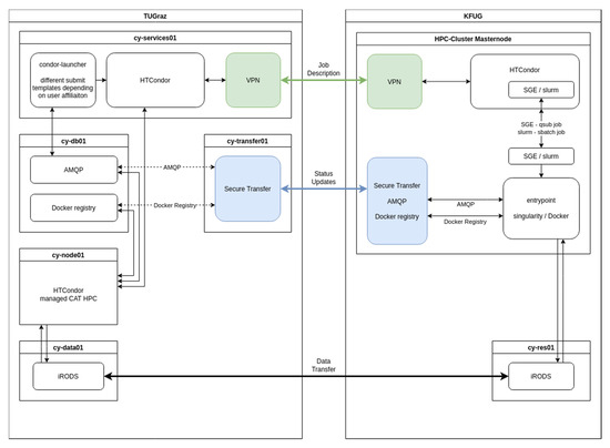 CAT users are eligible to use the HTCondor node provided by TUG, and, based on their affiliation, may also have the possibility to use the HPC provided by KFUG to perform analysis. To support this, CAT may transfer jobs to the HPC system of KFUG. The decision to transfer jobs to another HPC is based on the affiliation using the condor-launcher sub-system, as depicted in Figure 4. For CAT jobs not transferred to the KFUG HPC, the submission of an analysis uses Docker containers. A single job run is controlled by HTCondor and submitted to the main HPC node cy-node01. There, the analysis is wrapped in 3 distinct steps: (1) connecting to the data store using iRODS to provide the data to the analysis container, (2) the analysis container where the actual calculations take place, and (3) connecting to iRODS to put the data from the analysis in step 2. To have continuous updates on the job status, the Advanced Message Queuing Protocol (AMQP) [44] is used. Whenever a user has the affiliation and rights to use HPC resources at KFUG, jobs are managed differently. These external jobs can be run using other HPC resources managed by other queueing systems as SGE [37] or slurm [40]. In the following, the job is run using SGE scheduler on the KFUG HPC system as described in detail, but this can also be applied to systems using slurm as the workload manager. Such analyses are performed by transferring the job description via a secure VPN connection to an HTCondor transfer node located at KFUG. At the transfer node, the job description is translated into a job description for SGE. As the KFUG cluster only provides Singularity, additional steps are required to transform the Docker container to a Singularity container. Data and status updates are transferred using secured VPN connections to provide CAT with information using AMQP. Data transfer itself is managed by iRODS and ensures all data required to run the analysis and results are available at the HPC as well as in CAT.