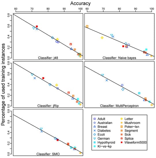 Even when the lack of memory is not usually an issue nowadays, similar concerns arise when mining big and/or distributed data, i.e., the impossibility or inconvenience of using all the available examples to induce models. Windowing has been used as the core of a set of strategies for Distributed Data Mining (DDM) [9] obtaining good accuracy results, consistent with the expected achievable accuracy and number of examples required by the method. On the contrary, efficiency suffers for large datasets as the cost of testing the models in the remaining examples is not negligible (i.e., the for loop in Algorithm 1, line 6), although it can be alleviated by using GPUs [10]. More relevant for this paper is the fact that these Windowing-based strategies based on J48, the Weka [11] implementation of C4.5, show a strong correlation () between the accuracy of the learned decision trees and the number of examples used to induce them, i.e., the higher the accuracy obtained, the fewer the number of examples used to induce the model. The windows in this method can be seen as samples and reducing the size of the training sets, even up to a 95% of the available training data, still enables accuracy values above 95%.