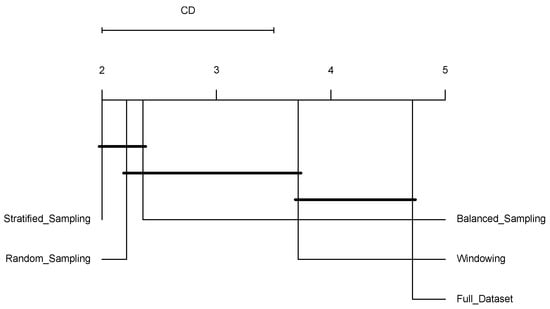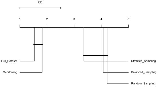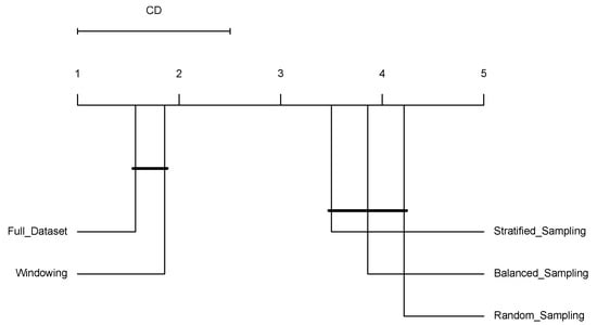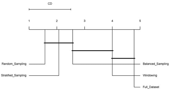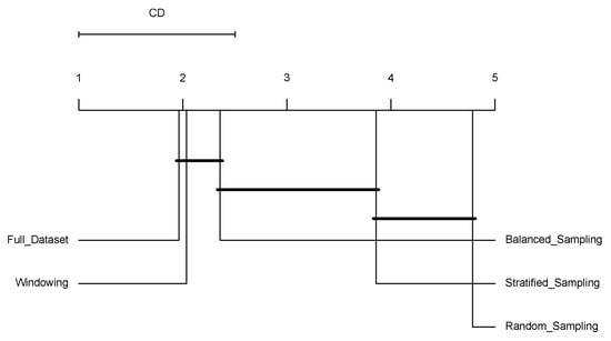 Figure 2 shows the results for the number of bits required to encode the induced models () presented in Table 6. The groups of connected algorithms are not significantly different. In this case, the complexity of the models induced using windowing does not show significant differences with the complexity of the models induced using the Full-Dataset or balanced sampling.