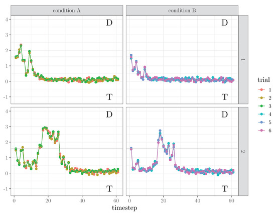 Simulated mouse-tracking trajectories plotted over time step . The data refer to a univariate design with (rows of the plot), (columns of the plot) and (colors of the plot). Note that each of the K levels has trials, T and D indicate Target and Distractor sections of the movement space.