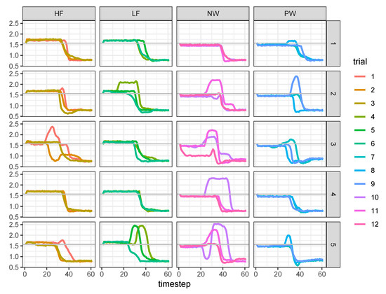 In this section we provide a full example of the way ssMousetrack can be used for state-space analysis of real computerized tracking data. Note that the application reported here has an illustrative purpose only. To this end, we will make use of the dataset language, a subset of data originally presented in Reference [39]. In this typical computerized tracking task, participants saw a printed stimulus on the screen (e.g., the word water) and were requested to perform a dichotomous choice task where stimuli need to be classified as word or non-word. The experimental variable condition was a categorical variables with four levels (HF: High-frequency word; LF: Low-frequency word; PW: Pseudo-word; NW: Non-word). Participants had to classify each stimulus as word vs. non-word by using a computer-mouse tracking device. The dataset contains participants, trials, one categorical variable with levels, each with trials. From the data-analysis viewpoint, we evaluat the extent to which the parameters of the state-space model reflect eventual differences associated with the levels of condition.