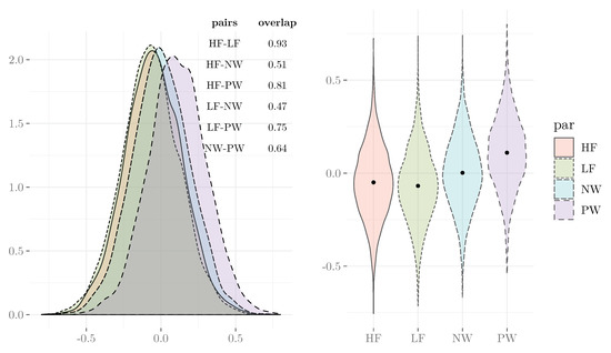 where, in this case, the prior for have been choosen to codify a priori expectations about the effect of the variable condition [39]. Figure 4 shows some MCMC graphical diagnostics for the model parameters computed using bayesplot [37] whereas Table 2 reports the posterior quantities for the model parameters. In the Bayesian context of data-analysis, we evaluate the effects of the variable condition by computing the degree of overlapping among marginal posterior densities for each level of the experimental variable (i.e., the more the overlapping, the weaker the evidence supporting the experimental manipulation). Figure 5 shows the results graphically. Overall, the variable condition showed no strong effect, as the densities of the levels are overlapped. In particular, stimuli in HF, LF, and NW conditions showed no activation of the distractor section of the tracking space as , , and approach zero. By contrast, stimuli in PW condition showed a small effect on activating the target section (), possibly due to the fact that PW stimuli require less cognitive workload [39].