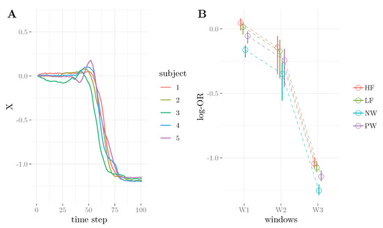 Figure 6A reports the filtered latent states for the subjects in the dataset. To further investigate how individual dynamics differ over the levels of condition, we can make use of and ask whether HF, LF, NW, and PW stimuli differ in terms of evidence of mouse-tracking competition. The idea is that the higher the evidence, the larger the difficulty in categorizing stimuli as word (target) or non-word (distractor).