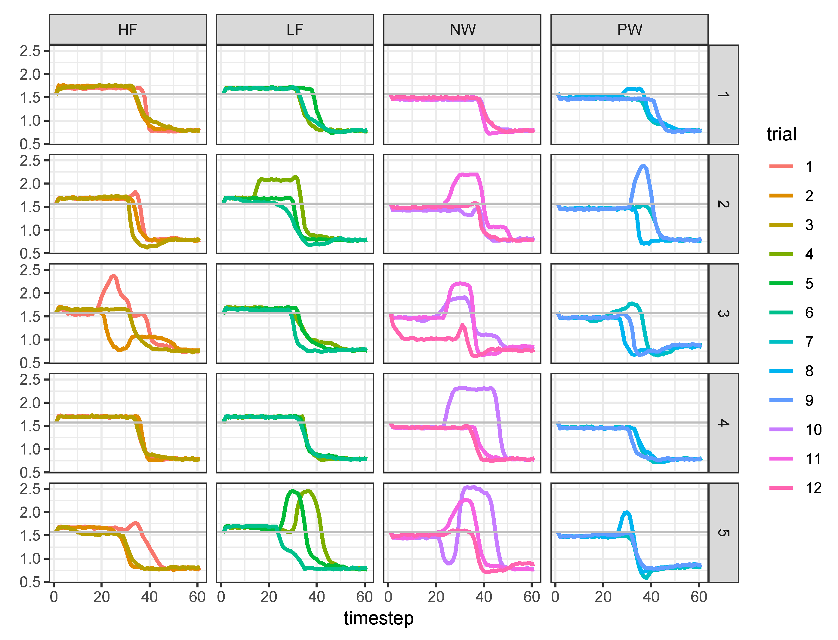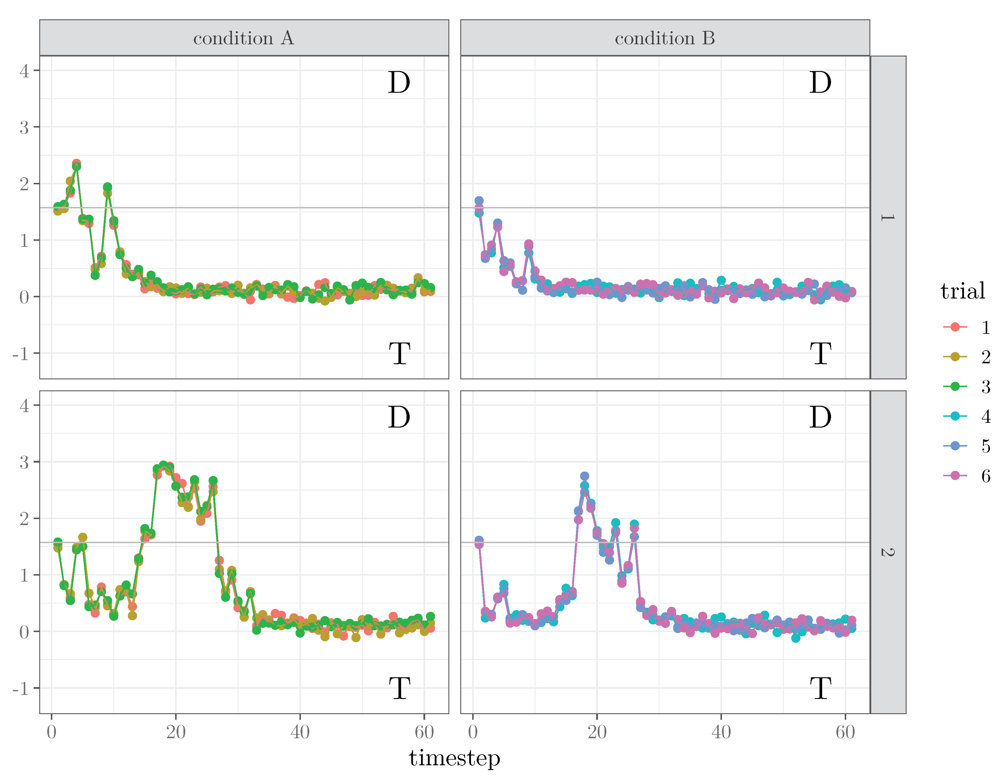 - data, which contains the matrices of latent states and trajectories , together with , , and :## List of 5## $ Y : num [1:75, 1:61, 1:12] 1.54 1.53 ...## $ X : num [1:75, 1:61, 1:2] 1e-04 1e-04 1e-04 1e-04 1e-04 ...## $ MU: num [1:75, 1:61, 1:12] 1.57 1.57 ...## $ D : num [1:75, 1:61, 1:12] 0.785 0.785 ...## $ Z : num [1:12, 1:2] 1 1 1 1 1 ...
