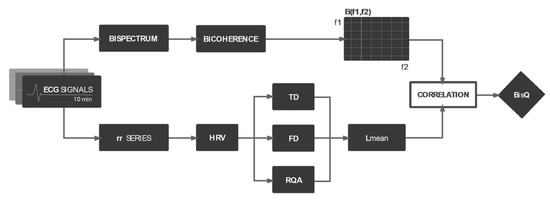 This study was divided into three stages: Finding the correlation between individual bicoherence Matrix components and RQA-derived nonlinear components in a sample of ECG traces; Introduction of the bispectral quotient (BisQ) feature and its estimation; and the exploration of BisQ among different groups of ECG recordings.