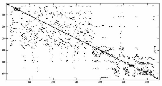 Recurrence plot obtained from a 10-min tachogram. The following HRV RQA values were obtained from this RP: RcRt = 0.0153; DET = 0.5693; ENTR = 0.7314; Lmean = 2.56579.