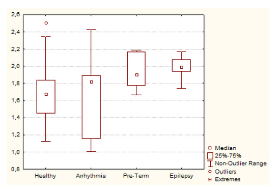In Figure 4, a Box and Whisker Plot summarizes the values of BisQ in the four groups studied. As it can be observed from Figure 4, BisQ seems to be higher among persons with epilepsy as well as preterm infants, whereas persons with arrhythmia have similar mean and a higher dispersion as compared to healthy persons.