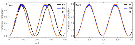 with and as an example of periodic function. Starting from the initial condition , we compute the approximate solution until the final time , i.e., for 487 periods, with the Floquet–Magnus (FM) expansion (20)–(21) up to and and determine the corresponding transition probability. In this way, we get Figure 1, where the result achieved by the effective Hamiltonian , with , is also depicted. We see that, for this value of , considering more terms in the series for both and F leads to better results and that working only with the effective Hamiltonian gives indeed a good approximation. The reference solution is computed with the DSolve function of Mathematica. For completeness, the value of the effective Hamiltonian up to reads
