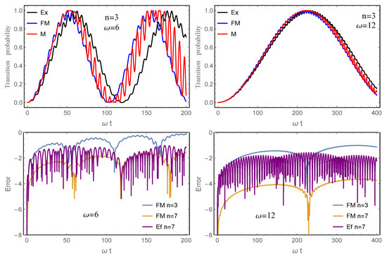 Next, we repeat the simulation with and , by taking terms in both the Floquet–Magnus and the Magnus expansion (17). The results are shown in Figure 2 (top). Notice that the approximations get worse for smaller values of . To get a more quantitative view, also in Figure 2 (bottom) we show the error in the transition probability (in logarithmic scale) for the same values of , but now include and terms in the FM expansion, as well as the result obtained with just the effective Hamiltonian in this last case. As is clear from the figure, taking into account more terms in the FM expansion improves the approximations, and this improvement is more remarkable for larger values of .
