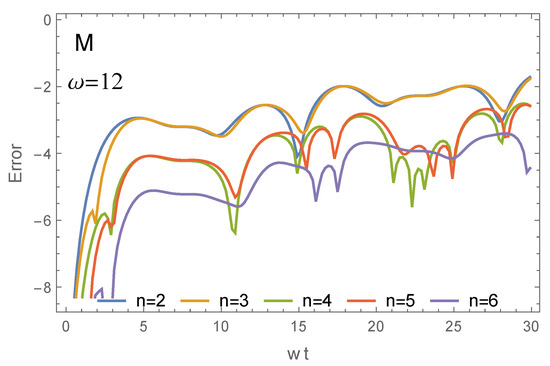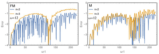 with and , and compute approximations using the Floquet–Magnus and Magnus expansions with and terms. The corresponding errors in the transition probability are shown in Figure 3. We see that, in this case, including more terms in the expansions does not improve significantly the accuracy of the approximations. This is an indication of the lack of convergence of the expansions for these values of the parameters. In fact, it is straightforward to verify that , so that for the values of the parameters considered, the convergence of the Magnus expansion is ensured for according to the estimate (19). To illustrate the behavior in this range of times, in Figure 4 we collect the results obtained by taking up to terms in the expansion. It is worth noticing the systematic decrease in the error when more terms are included in the expansion. A similar pattern is observed for the Floquet–Magnus expansion, but with much smaller times (the convergence is only assured for ).