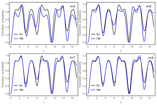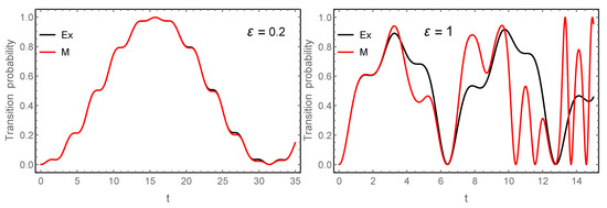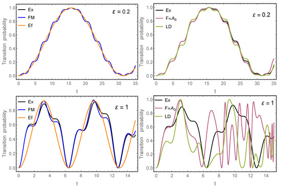Thus, in particular, if , then , whereas, for , it reduces to . We cannot expect, then, accurate results for larger time intervals, and this is indeed what is observed in practice. Something analogous also happens for the Floquet–Magnus expansion, with the difference that the interval of convergence is even smaller. It makes sense, in consequence, to apply both procedures in the interaction picture, i.e., to the matrix and this is what we have done in our computations by applying the procedure of Section 4. We also compare with the Lie–Deprit (LD) perturbation algorithm and the formalism removing the perturbation, i.e., such that . As in the previous example, we compute , i.e., the probability of transition between the two levels, obtained with each procedure with terms. The corresponding results are shown in Figure 5 as a function of time, where we also include the exact result for comparison. Left diagrams are obtained with FM (in the interaction picture), whereas we depict in the right diagrams the results obtained by LD and also when F is taken as . Notice that top and bottom panels correspond to and , respectively. We have also depicted the result obtained with just the effective Hamiltonian in the case of the Floquet–Magnus expansion.
