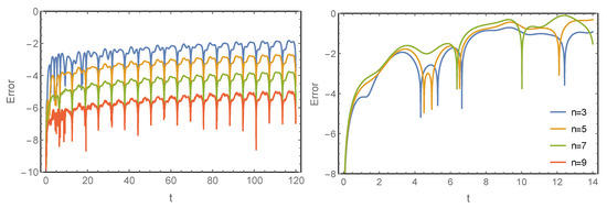 For comparison, in Figure 6 we collect the results achieved by the standard Magnus expansion in the interaction picture for this same problem and values of the perturbation parameter: (left) and (right). Here again, increasing the value of leads to a loss of accuracy for long times. If the Magnus expansion is applied to the matrix , then only accurate results are obtained for times in the convergence domain.