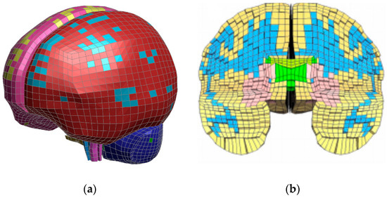 THUMS4.01 brain meshed model (a) [26] vs. GHBMC brain meshed model (b) [25]. (a) THUMS brain model, (b) GHBMC brain model (cross-section).