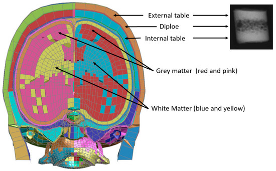 THUMS 4.01 is very efficient as the model contains one general global single surface contact, while the GHBMC has in excess of 400 contacts, which has the consequence of increasing the runtime because of the contact search algorithms. The skull is composed of 3 separate layers, which represent the diploe and the internal and external tables [30], as illustrated in Figure 2.