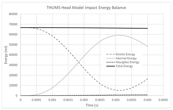 It can be observed in Figure 3 that the total energy is constant during the computation of a fall with a negligible rise of hourglass energy, showing that no element locking is present and that all the contacts inside the brain model are working as intended.