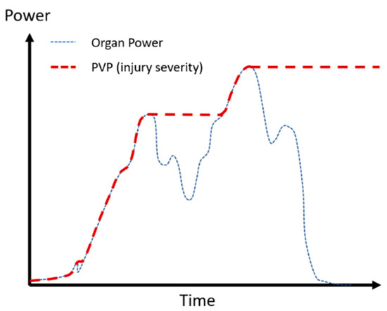 Injury severity can be computed from a concept called Peak Virtual Power (PVP). Peak Virtual Power is based on the general principle of the second law of thermodynamics, stating that entropy (state of disorder) increases after each mechanical process [12,33,34]. When a collision takes place, the entropy (represented by PVP) always increases, never to return. A typical pattern of this behaviour is illustrated in Figure 4, power goes up and down, while PVP always keeps to the maximum value at all time, PVP is proportional to the maximum rate of entropy production and as Schrodinger said, “a body reaches a maximum state of entropy, which is death” [35].