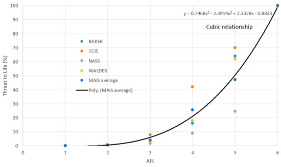 It has been observed in real life that there was a cubic relationship between the threat to life and AIS [36], shown in Figure 5.