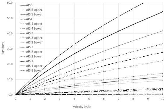 As an illustration, any OTM, will be therefore represented by a graph containing the relationship between PVP, impact velocity and AIS, as illustrated in Figure 6. It has been possible to include error corridors (upper and lower) for each AIS value by considering the spread of data from Figure 5.