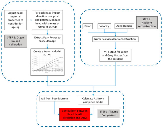 In step 3, in the simulation, PVP will be calculated and overlaid over the OTM model. Another important point to notice is that the method used to reconstruct the accidents is using finite elements. As a general principle, finite elements discretise the problem in small elements, which are connected to each other, so the sum of these elements represents the whole problem. By cutting the problem in small parts, it is possible to investigate what can happen locally: this method is used to analyse complex shapes that differ greatly from, for example, simple beams or plates that have been solved by engineers. Usually, organs with a three-dimensional aspect are represented by connected cubes (hexahedrons) or triangular-based pyramids (tetrahedrons). This is the case with the computer model used in this study (THUMS 4.01). During the impact, these elements deform, stretch and change shape; however, their volume remains constant. It is called a “Lagrangian” representation of the problem. The consequence, is that, should bleeding occur in the real-world, i.e., loss of volume due to the blood escaping the organ, then the finite elements will not be able to capture this. In order to include the bleeding effect, it is proposed to include the effects of Subdural Hematoma (SDH), which has been defined for an MPS value of 25.5% [46]. The problem then is to assert the AIS outcome from bleeding, as a small bleed could add ‘1’ to the AIS level to the current trauma severity computed or ‘2’ if the bleeding is judged to be important by the pathologist [47]. In some cases, the quantity of blood loss could be subjective, hence for the purpose of being consistent and conservative, all instances of blood loss for the purpose of this study have a ‘+1’ AIS increment on the base AIS computed.