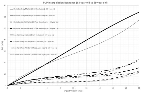 Recent research in falls has produced three papers that are relevant to this study [18]. The paper on “Certified Motorcycle Helmets: Computational Evaluation of the Efficacy of Standard Requirements with Finite Element Models” [19] concentrates on the efficacy of the helmets but uses their own FE model to assess injury metrics for the brain. This model uses hydrostatic pressure and the maximum principal strain against thresholds from the literature, which are quite wide. The results indicated that the helmets were not giving adequate protection against the thresholds; however, no estimate of injury severity was provided. The second study, “The Strain Rates in the Brain, Brainstem, Dura, and Skull under Dynamic Loadings” [20] indicates that the strain rate is important for the type of material models used, which supports the use of PVP. The third study, “Mechanism of Coup and Contrecoup Injuries Induced by a Knock-Out Punch” considers the effects of a single punch on the brain by modelling the cerebrospinal fluid interactions with the brain tissues, based on Smooth Particle Hydrodynamics (SPH). The first deviatoric principal stress was used, and found that the contre-coup injury indicated was higher than that of the coup injury [21]. Finally, the paper by Zhou [22], although not yet peer-reviewed, is relevant, and shows that there is considerable variation in levels of MPS depending on the anatomical model used; this gives support to the approach used here to age the THUMS model.