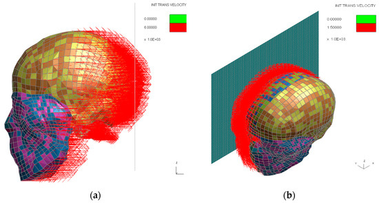 Setup of both load cases (occipital and parietal). (a) Occipital head impact velocity, (b) Parietal head impact velocity.