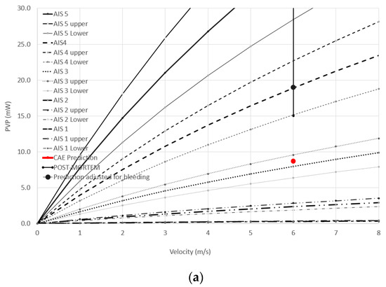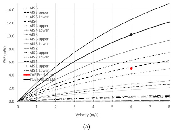 The PVP value computed was 8.58 mW, which is overlaid over the OTM model for an impact speed of 6.0 m/s. The trauma severity is therefore AIS 3, as illustrated in Figure 10a.