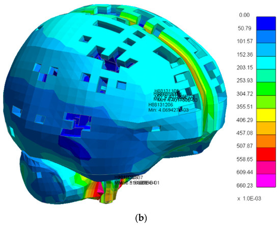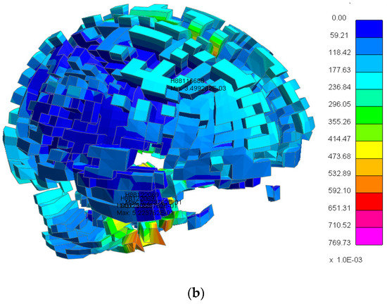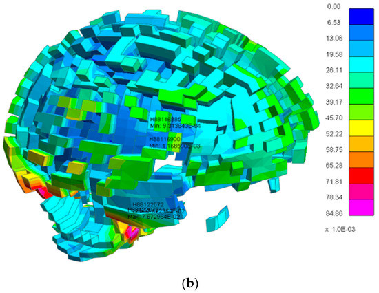 - Hosseini-Farid, M.; Amiri-Tehrani-Zadeh, M.; Ramzanpour, M.; Ziejewski, M.; Ghodrat Karami, G. The Strain Rates in the Brain, Brainstem, Dura, and Skull under Dynamic Loadings. Math. Comput. Appl. 2020, 25, 21. [Google Scholar] [CrossRef]