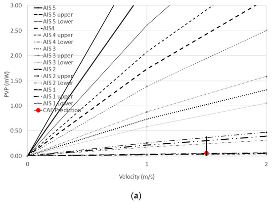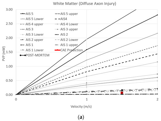 The PVP value computed was 0.07 mW, which is overlaid over the OTM model for an impact speed of 1.5 m/s. The trauma severity is therefore AIS 1, as illustrated in Figure 13a.