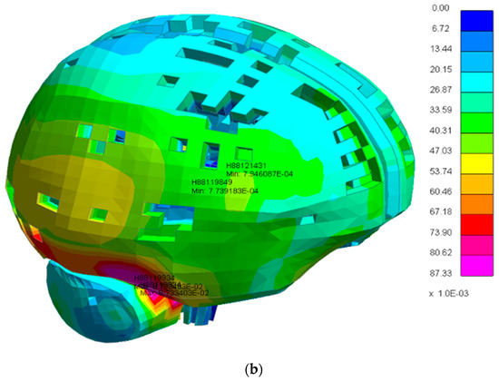 As the grey matter maximum principal strain did not exceed 25.5% (8.4%), the trauma severity remains unchanged, i.e., AIS 1 (Figure 13b).
