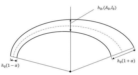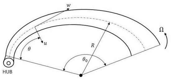 A scimitar-type rotating curved beam can basically be thought of as a thin rotating circular beam with a variable cross-section, as shown in Figure 1.