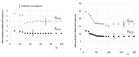 A typical convergence of the AMDM is shown in Figure 4 for the first two natural frequencies. The case that is shown is for and . Acceptable results can be seen with converging after about 40 iterations and after about 60 iterations. Generally, it was found that for higher modes more iterations were necessary.