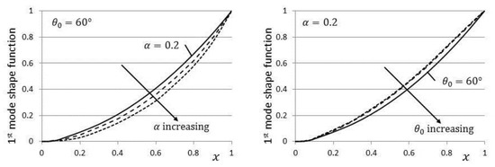 The first three mode shapes for , and are shown in Figure 6 using the nondimensional form shown in (36). Variations of the first mode shape with the taper parameter and with the opening angle are shown in Figure 7. The mode shape is shown to deepen as both and increase, as indicated by the arrows.