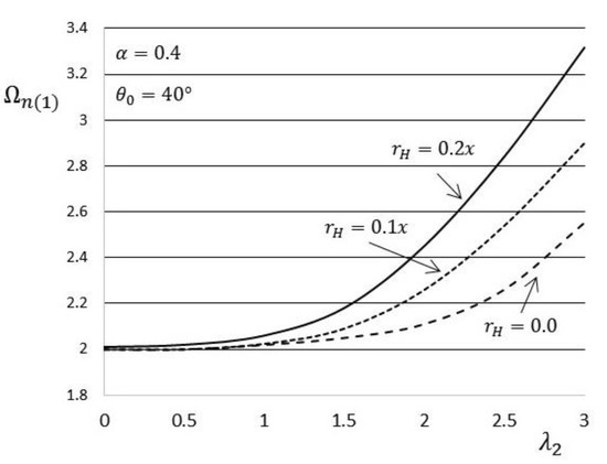 The effect that the variation of the hub radius parameter has on the first frequency parameter is shown in Figure 8. It can be clearly seen that an increase in the hub offset has a considerable effect on the first frequency, especially at higher rotation speed values. The first frequency generally increases with the hub radius.
