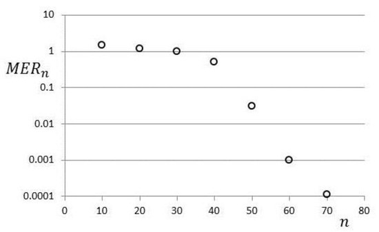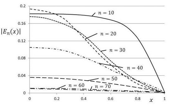 In Figure 9, it can be noted that the absolute error remainder values steadily decrease along the length of the beam, with very little movement noted between and In Figure 10, the maximal error remainder parameter is just above and it is noted that between and the points indicate a reasonably linear decrease, indicating an approximately exponential rate of convergence.