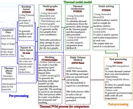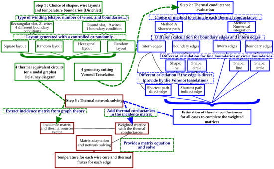 Figure 9 shows a clear understanding of tool process presented in this paragraph. A comparison with a Finite Volume Method (FVM) used in ANSYS FLUENT is done with the same boundaries and assumptions. All materials are solid domains, so only the thermal equation is solved. The domain discretization uses triangle elements and it is applied with GMSH meshing [21]. The common interface between the different materials is meshed with conforming mesh. The mesh is refined at core and insulation boundaries until the results are independent of the mesh. For the nodal model, to apply the mathematical process, the PYTHON code is used with some libraries. First, the random layouts are generated from a 2-dimensional real-time rigid body physics engine: PYMUNK library as described in a previous work [22]. The Delaunay and Voronoï networks are created thanks to Nocaj study [20] with different library tools in SCIPY library like Convexhull. The NETWORKX library [23] is used to save and transform Delaunay and Voronoï network. Each node and each edge is provided with full data like position, weight, dual edges id ... These tools provide the incidence matrix and the weighted incidence matrix. The Quadpack routine [24] via the SCIPY library is used to solve numerical integrals in the determination of thermal resistances. Finally, Equation (24) is solved with a standard linear algebra routine from Scipy based on the GESV Lapack routine [25].