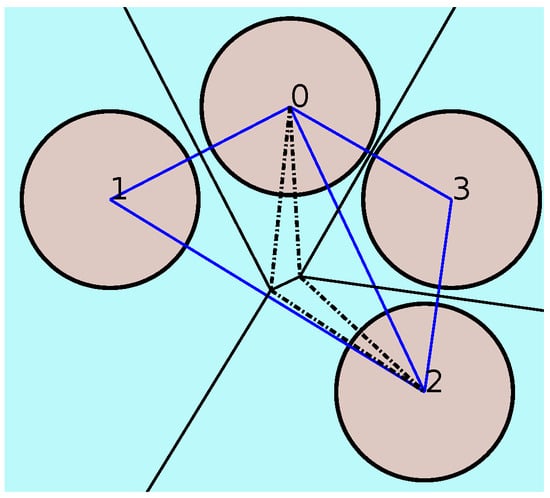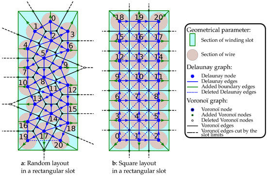 Figure 5a presents the first case and Figure 5b and Figure 6 presents the second case. Also, when a cell is connected to the boundary, the Delaunay node is directly linked to the boundary and the Voronoï cell is truncated (see Figure 7). The Voronoï edge is not necessary a segment and can respect a circular slot border as shown on Figure 7c,d. In these figures, the proportion of the insulation is increased for a better understanding. It is assumed that the heat flow between two wires is only exchanged through their shared Voronoï edge.