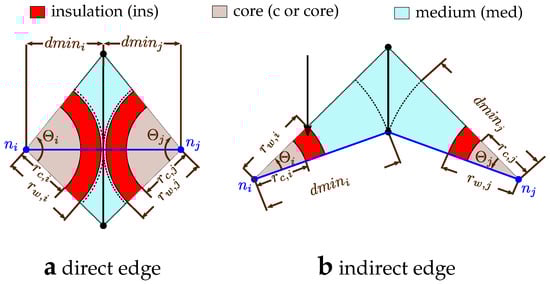 It is assumed that the heat flow from the core to the Voronoï edge is only radial. The wires are all identical and the cells on both side of a Voronoï edge are symmetrical. So, on the same edge, the two thermal resistances of insulation are equal (i.e., ). The insulation resistance is given with the cylindrical known resistances [17] as follow: