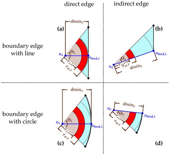 Cutting a boundary cell with the 4 possible cases: direct edge with a line border (a) or an arc border (c) and indirect edge with a line border (b) or an arc border (d).