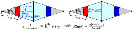 The thermal behaviour shows that the heat flow favours the easiest path. So in a uniform domain, it is the shortest path. In the a case, the shortest path is the distance between the two wires. So, in this segment, it is defined two identical lengths and . In the b case, the segment between two nodes does not cut the Voronoï edge, then the lengths and are defined by the shortest segment between the Delaunay nodes and the Voronoï edges. It corresponds to the shortest cell border. Then it is assumed to simplify the domain with the previous cylindrical resistances which symbolize the thermal resistance between the dotted arc and the insulation arc as follow: