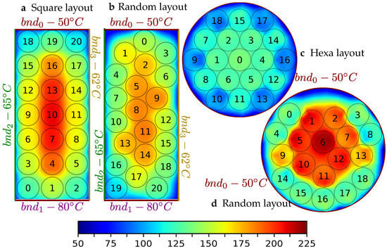 The heat-up between the hexagonal (c) and random (d) layout for the round shapes is not of the same order of magnitude. The heat-up in the hexagonal layout is very lower than the random layout. Indeed the hexagonal layout optimises a small and constant space between each wire. The insulation created by the air is minimised. Many wires are close to boundary and they help the heat flow to escape.