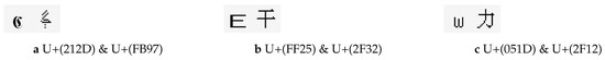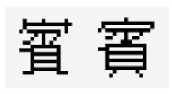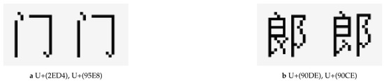 We omit Private Use Area (PUA) characters from the list of confusable character pairs provided by the Unicode consortium, since they are not defined by the Unicode consortium standard and are rather left to third parties for glyph formation, font creation etc. Also, we had difficulty in finding many of the fonts capable of rendering many scripts correctly. The work by [10] also faced similar problems during the dataset generation. Hence, the character pairs that were dependent on those fonts were also omitted in favor of having a cleaner dataset. Throughout the paper, we will refer to the set that consists of the character image pairs that look similar (dissimilar) as a similar (dissimilar) dataset. We used five fonts in total, namely, GNU, Unifont, EversonMono, Quivira, and Cunieform. For our similar dataset, we have 2257 character pairs. We have picked 1693 out of 2257 character pairs for the training, 385 character pairs for validation, and 179 character pairs for independent testing. For a binary classification problem, we need data with the opposite label, which, in this case, constitutes the different dataset. We have intentionally created a balanced dataset for our binary classification problem in order to avoid any issue related to imbalanced data [42,43]. The ratio of training-validation-test dataset is thus 75:17:8 (Table 1) summarizes the dataset that was used in our experiments. Figure 1 and Figure 2 show several example samples of our dataset.